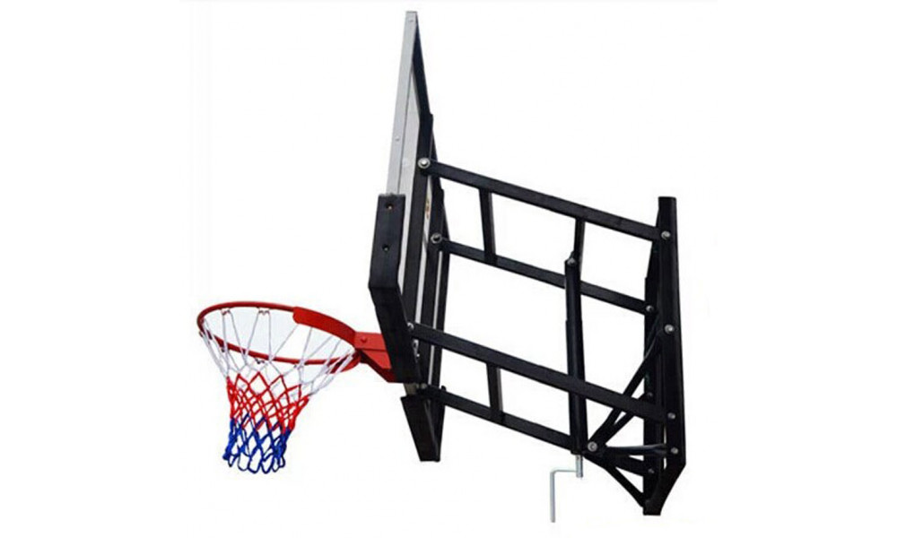 Баскетбольный щит для игры в баскетбол (стритбол). Крепится к стене (крепеж в комплекте). Предусмотрена регулировка по высоте с помощью рукоятки. Диапазон регулировки 75 см. Щит изготовлен из поликарбоната и имеет толщину 3 мм. По внешнему канту имеет стальную раму. В нижней части щита есть защитное покрытие (Poly pade). Кольцо стандартное диаметром 45 см, оранжевое. В комплекте всепогодная нейлоновая сетка.
